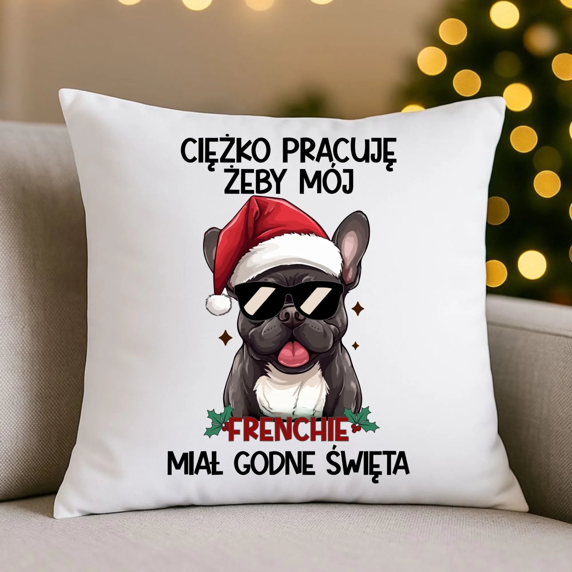 Poduszka świąteczna - Buldożek Francuski - Ciężko pracuję, żeby mój frenchie miał godne święta BN109