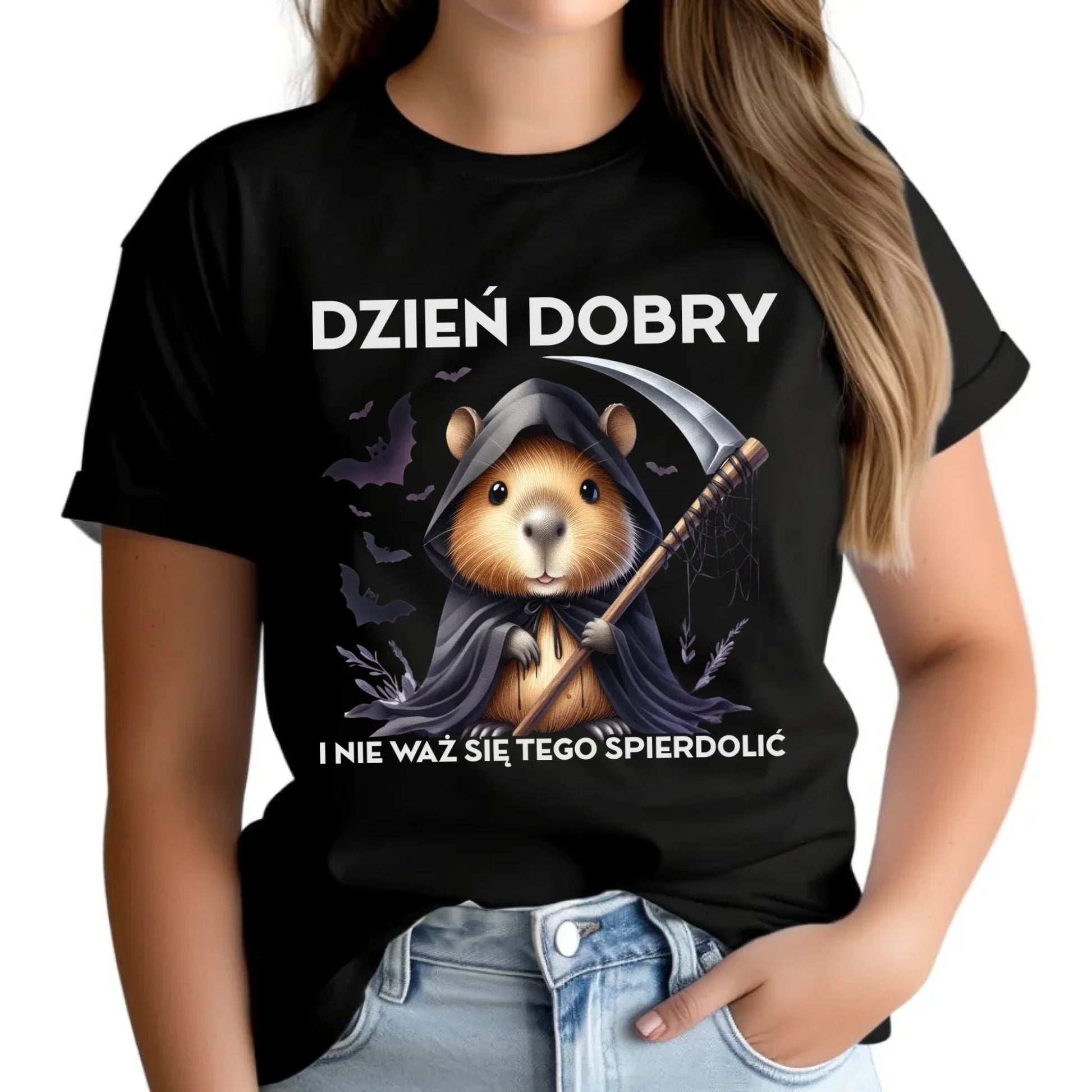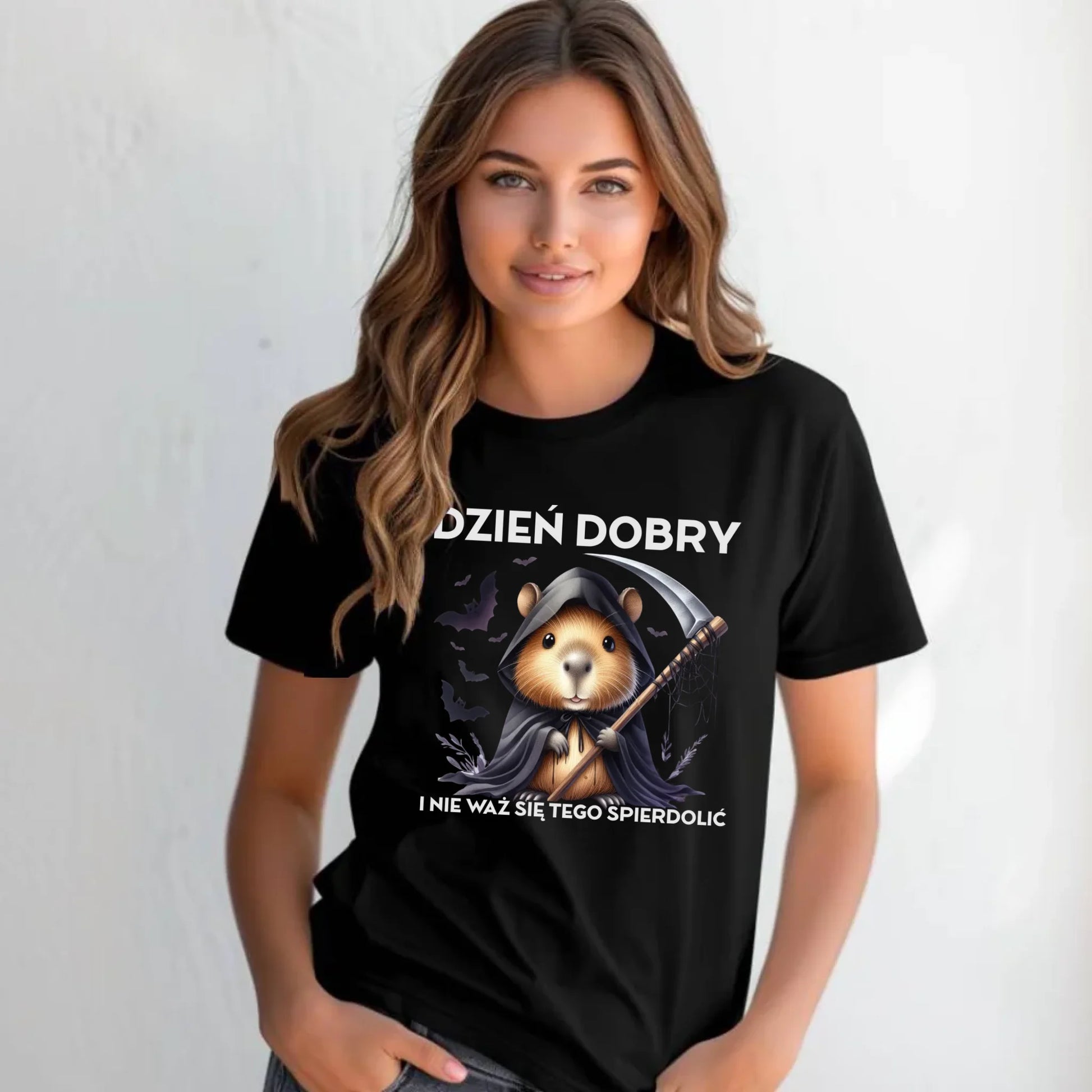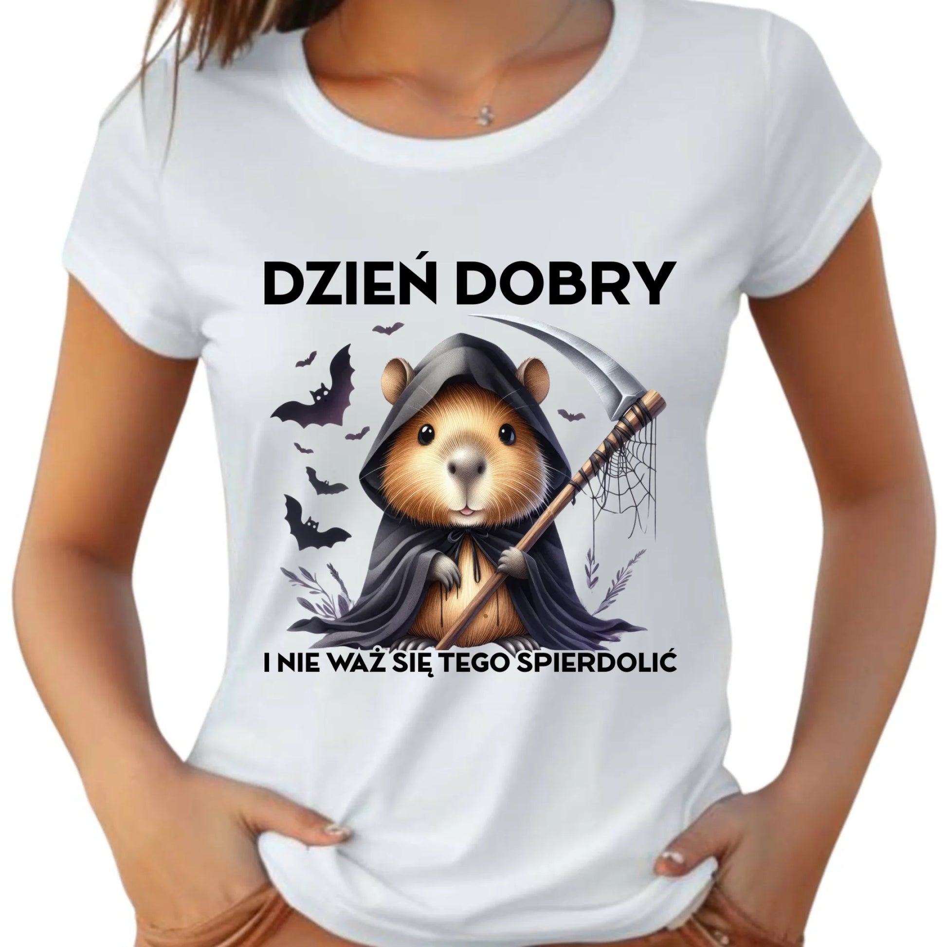 Koszulka damska halloweenowa - Kapibara Żniwiarz - Dzień dobry - bez cenzury HL20