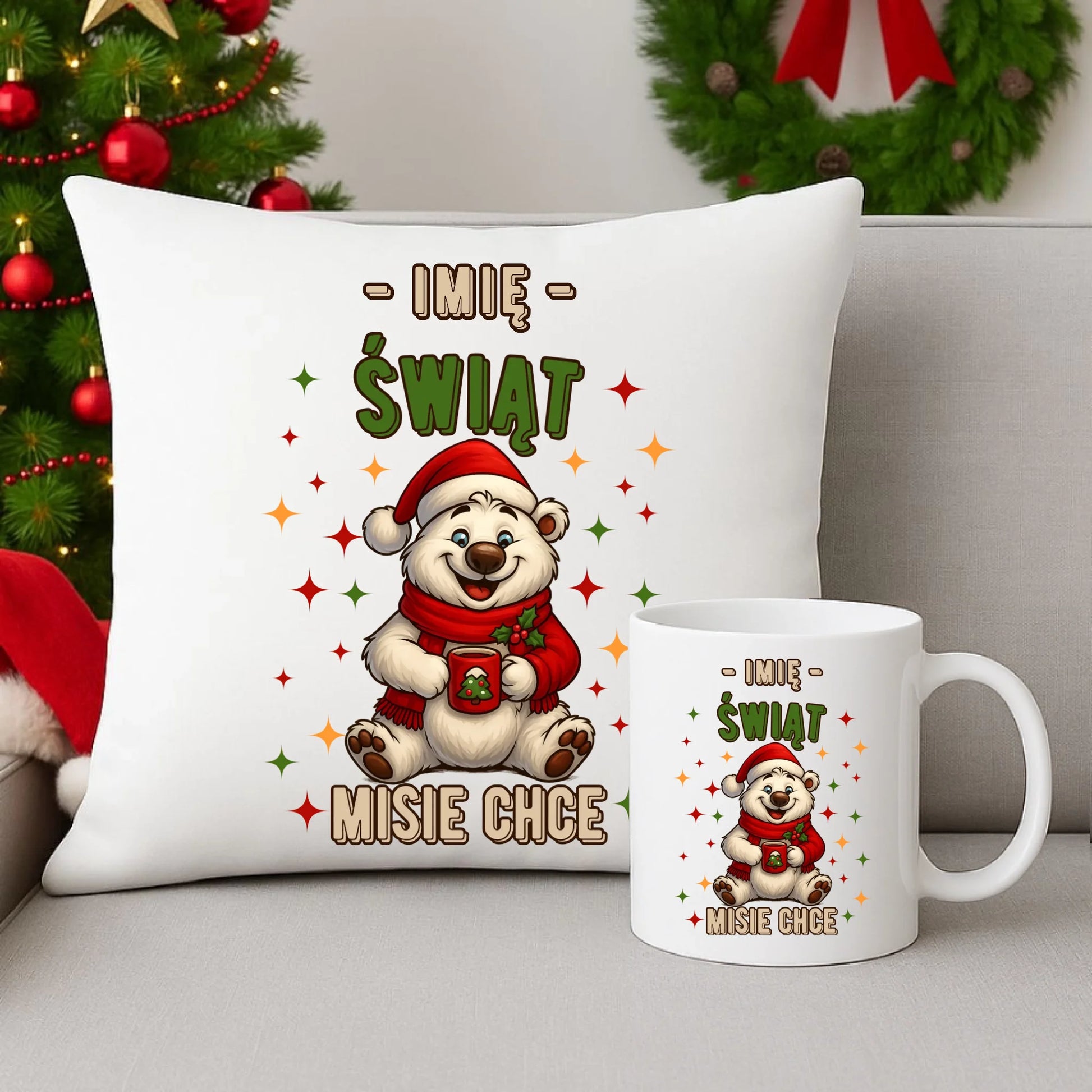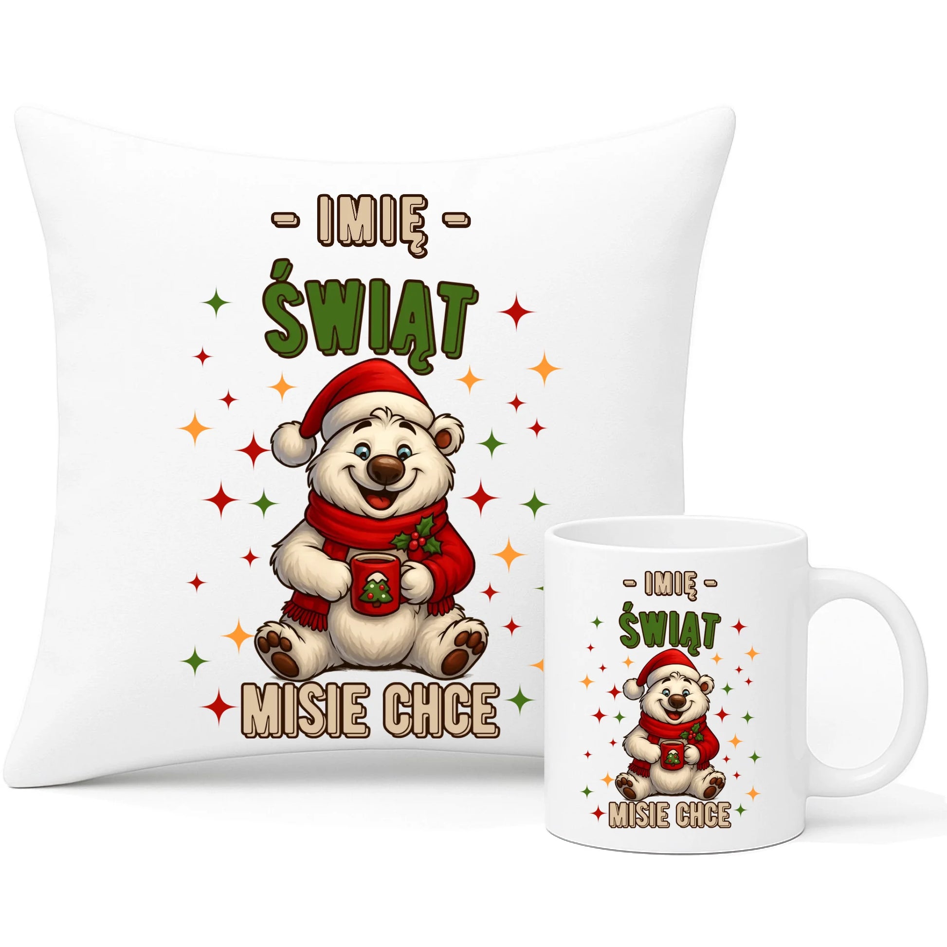 Zestaw poduszka i kubek świąteczny - Misiek Świąt misie chce - personalizowany BN86