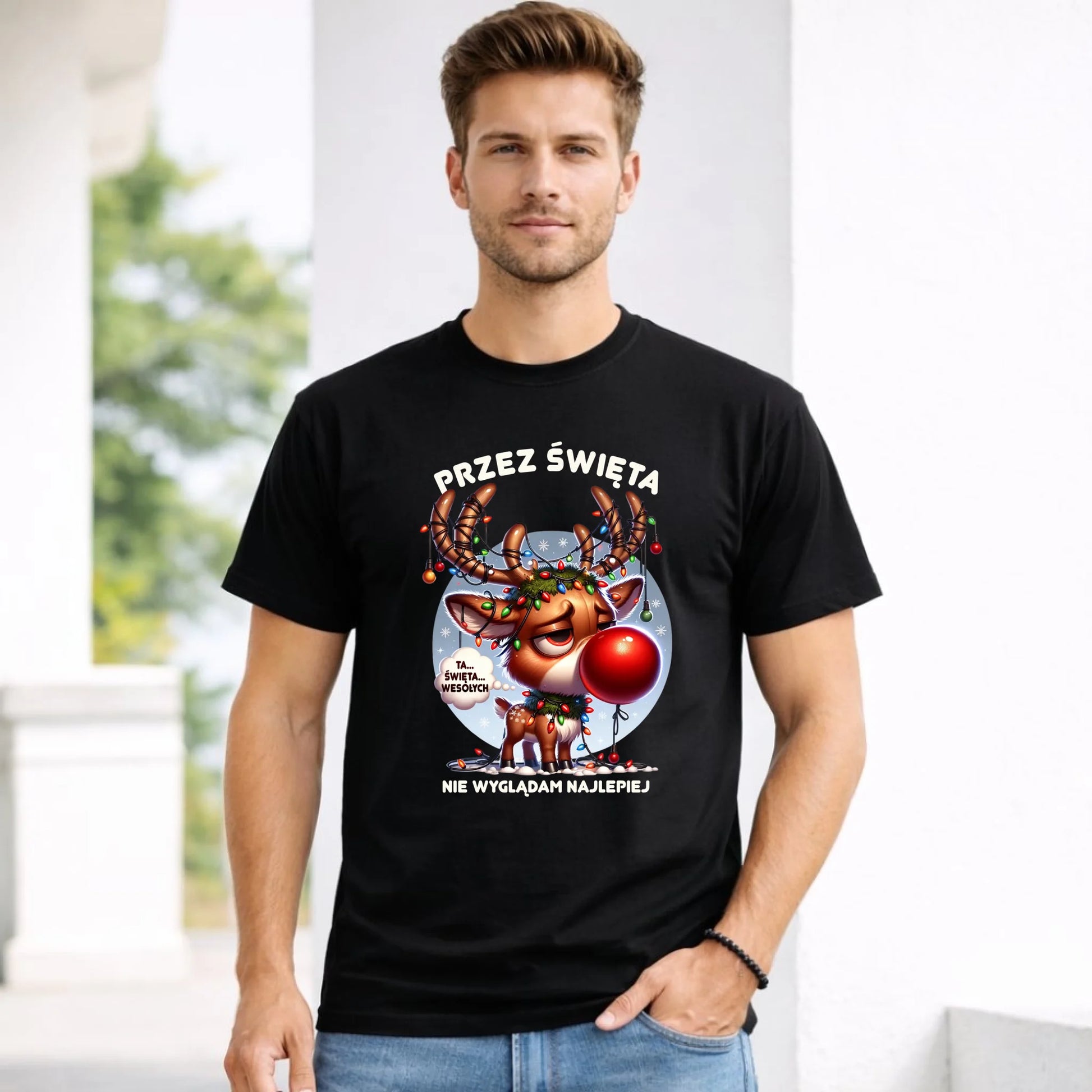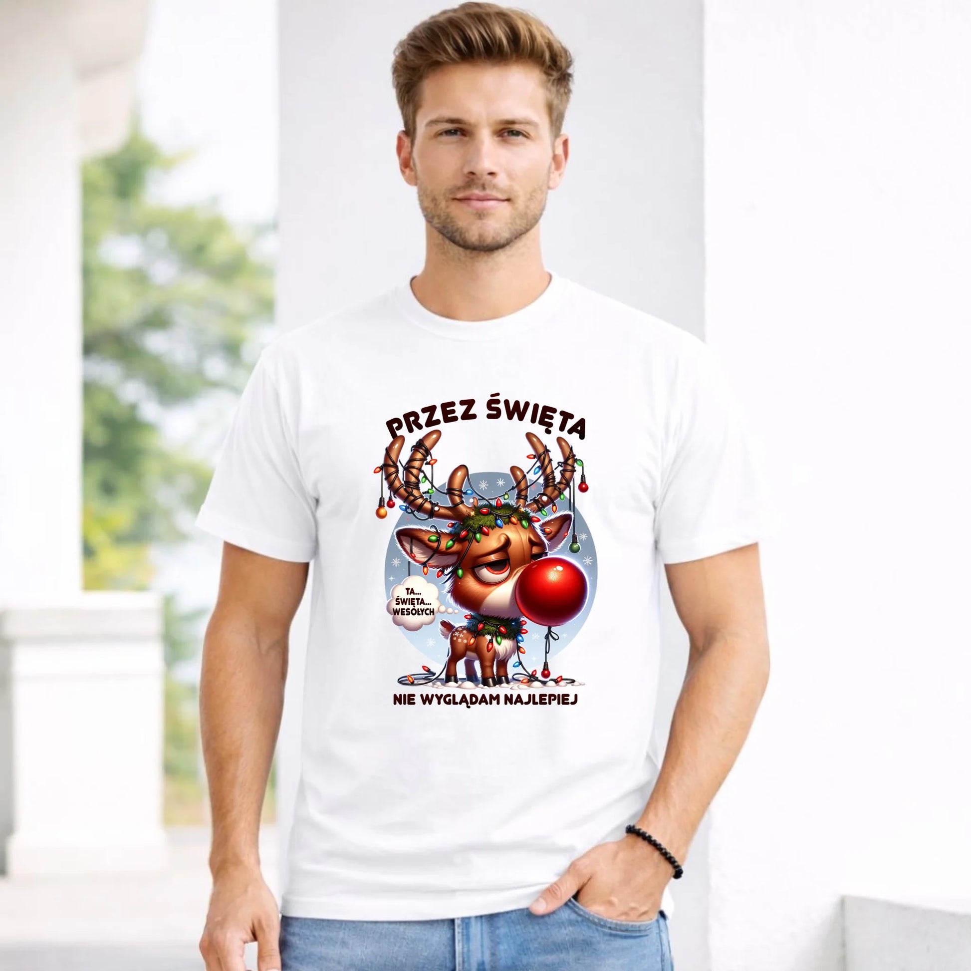 Koszulka męska świąteczna - Renifer Przez święta nie wyglądam najlepiej BN98