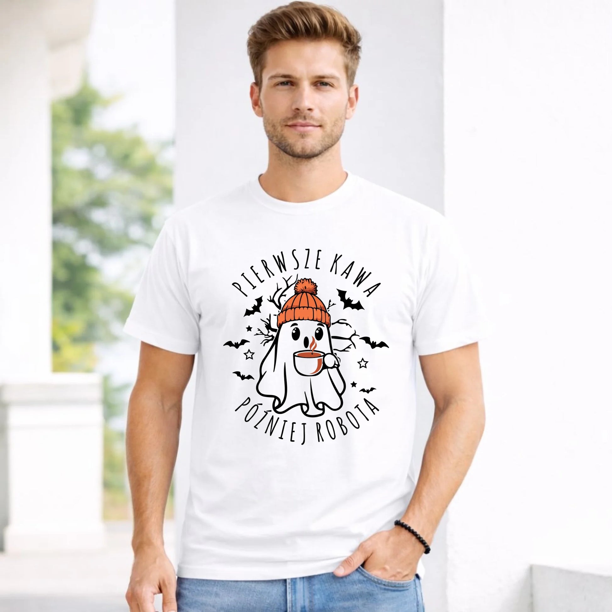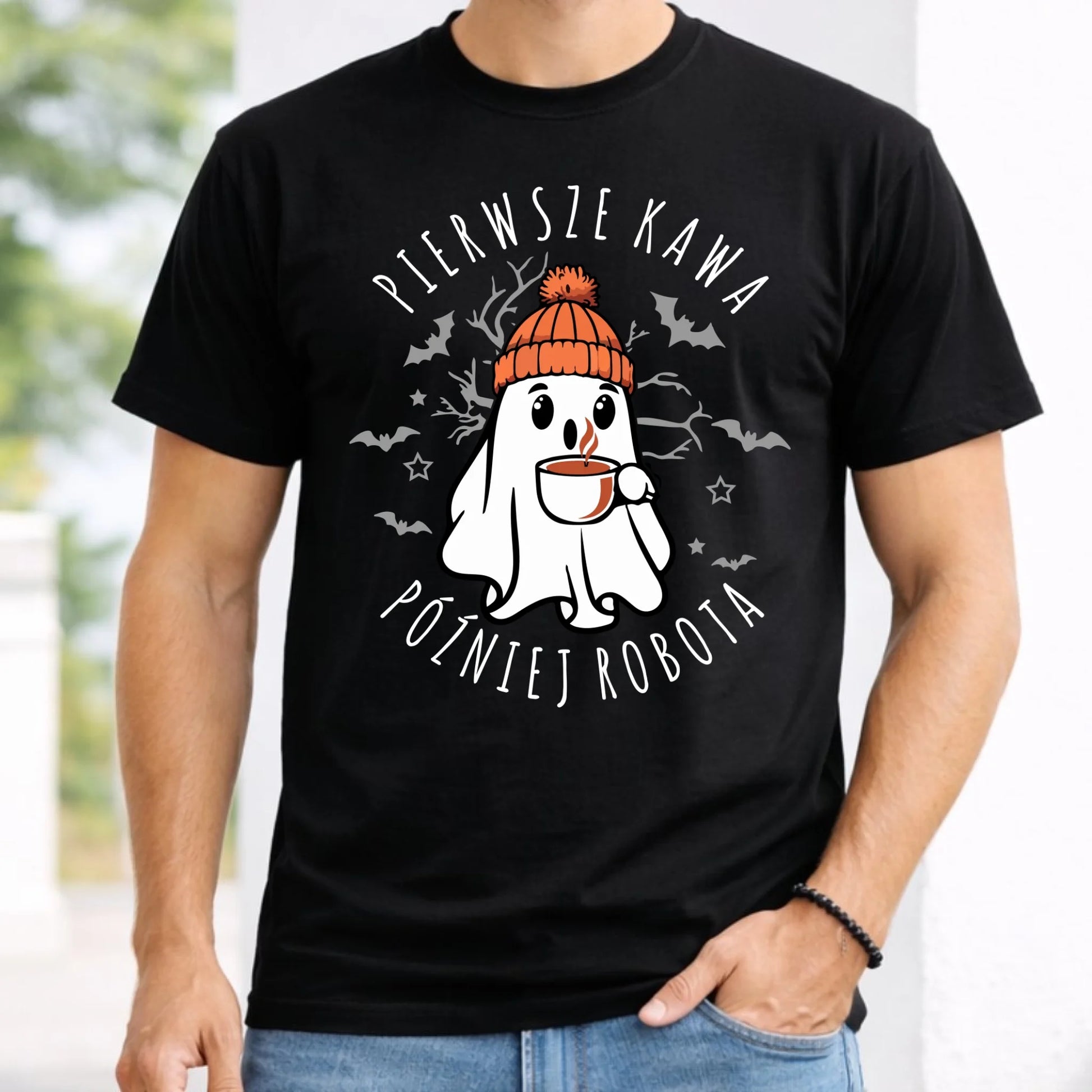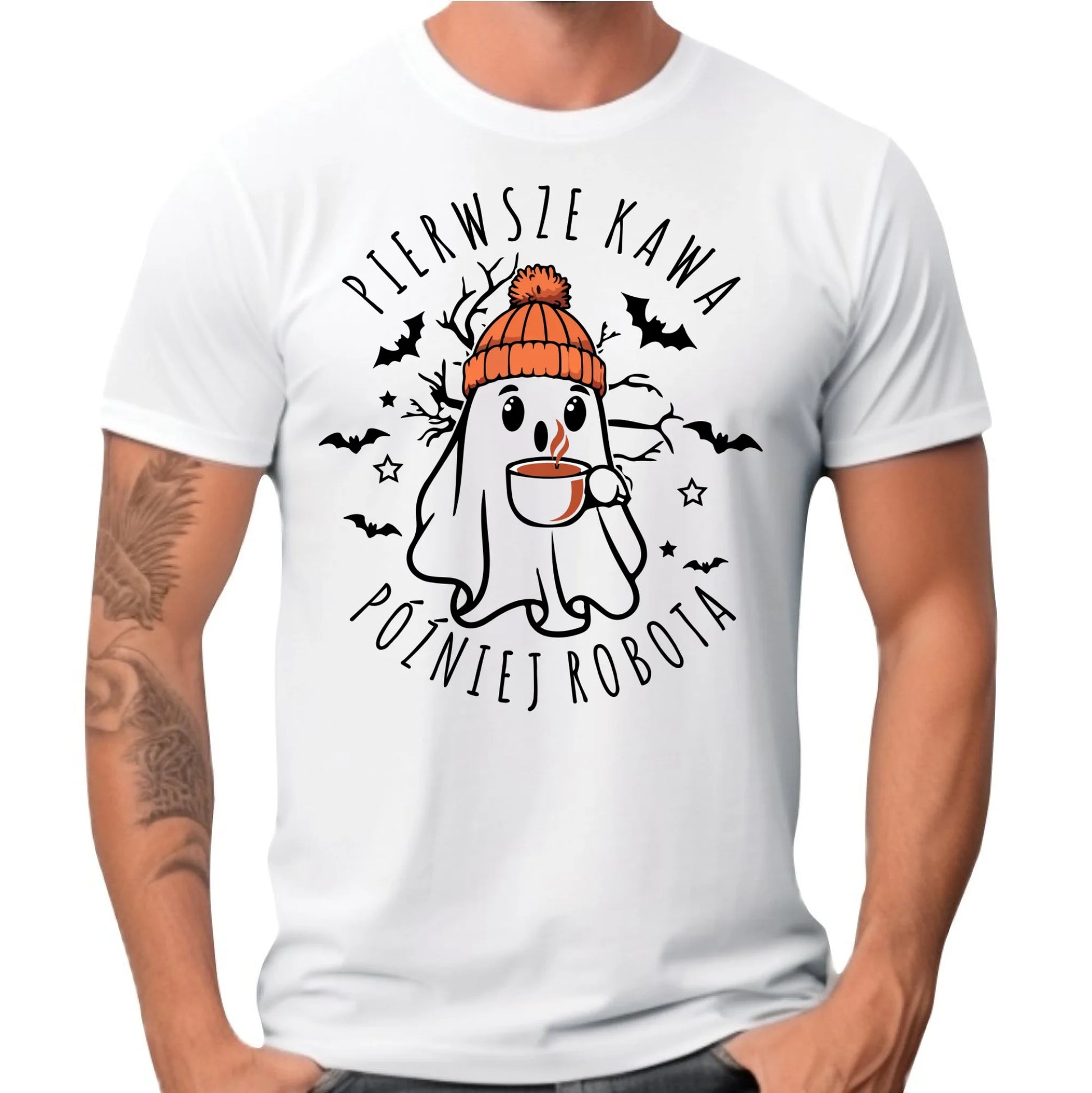 Koszulka męska halloweenowa - Duch z kawą - Pierwsze kawa później robota HL01