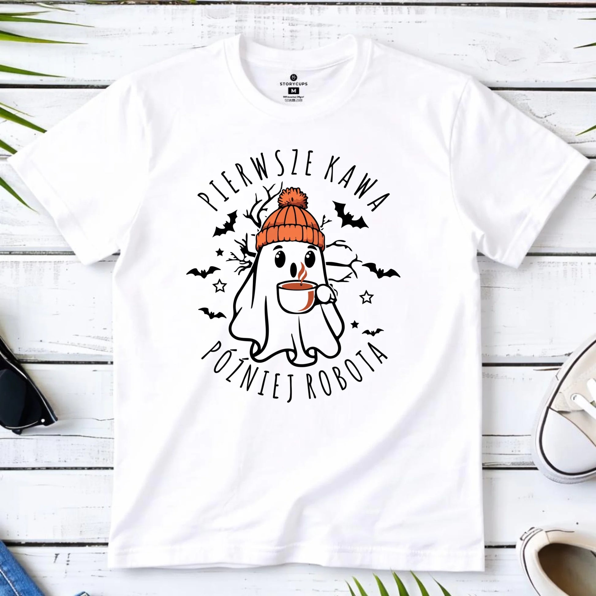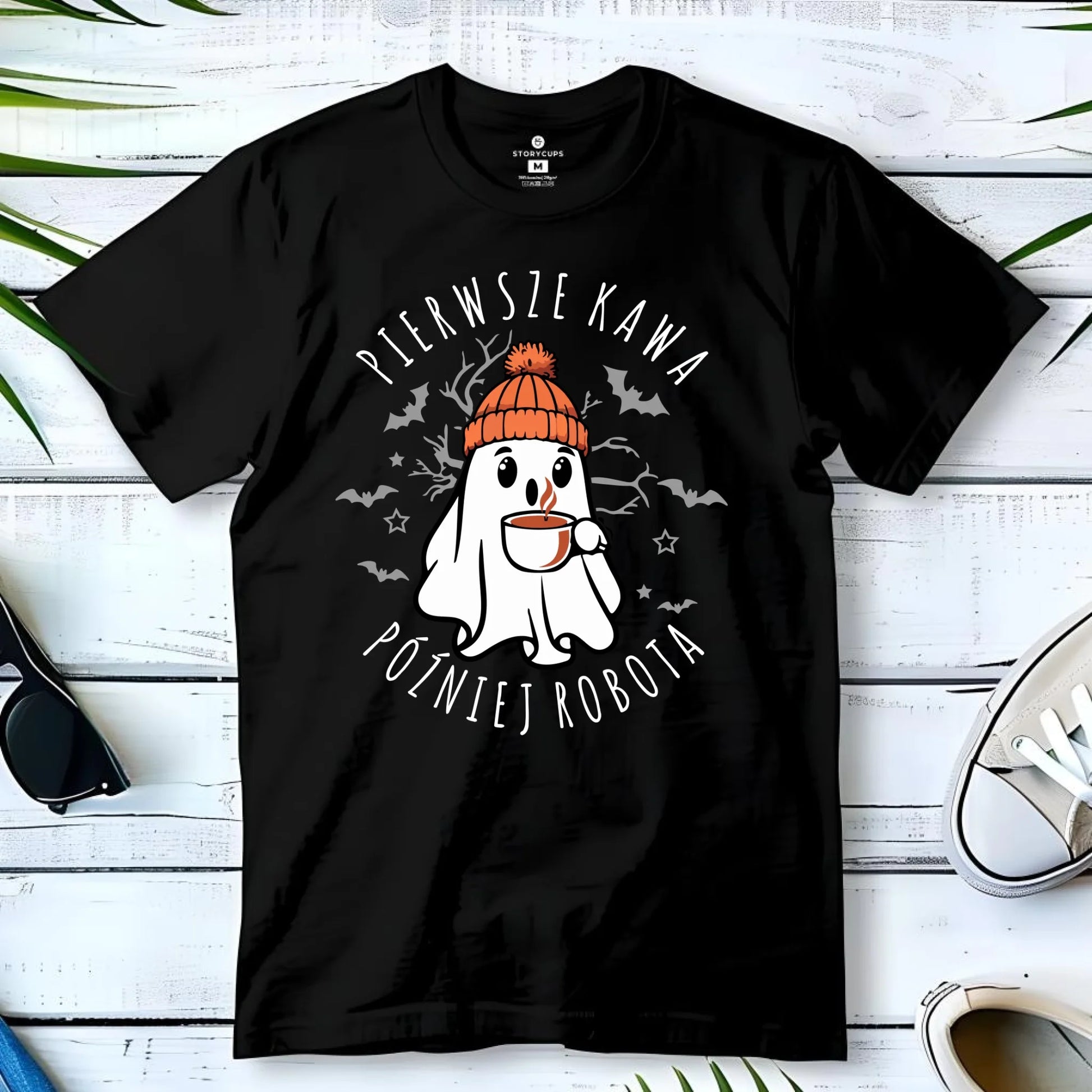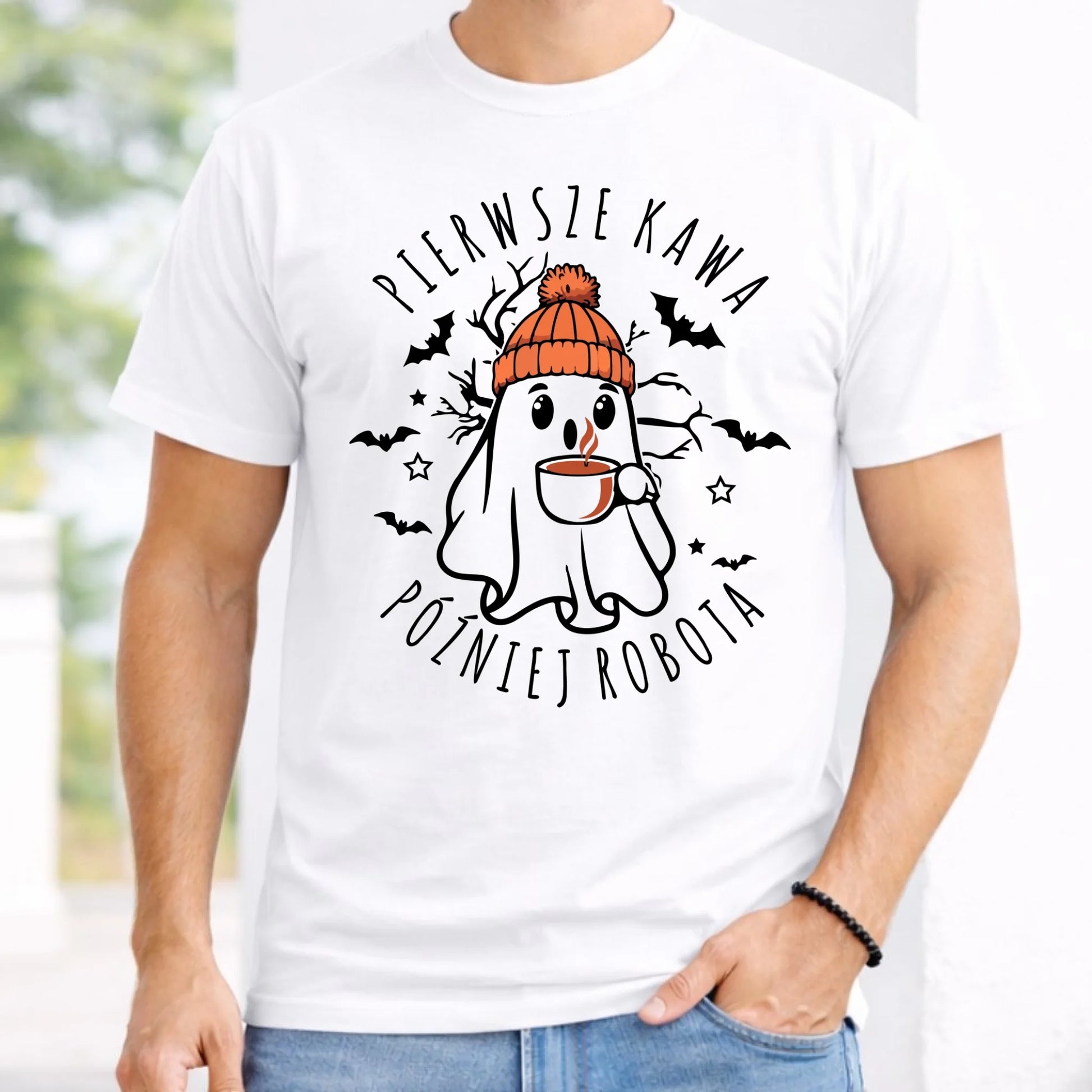 Koszulka męska halloweenowa - Duch z kawą - Pierwsze kawa później robota HL01