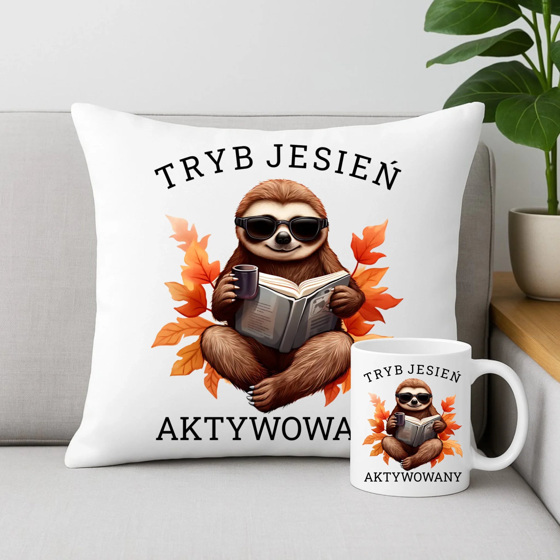Zestaw poduszka i kubek jesienny - Leniwiec - Tryb jesień aktywowany JS23