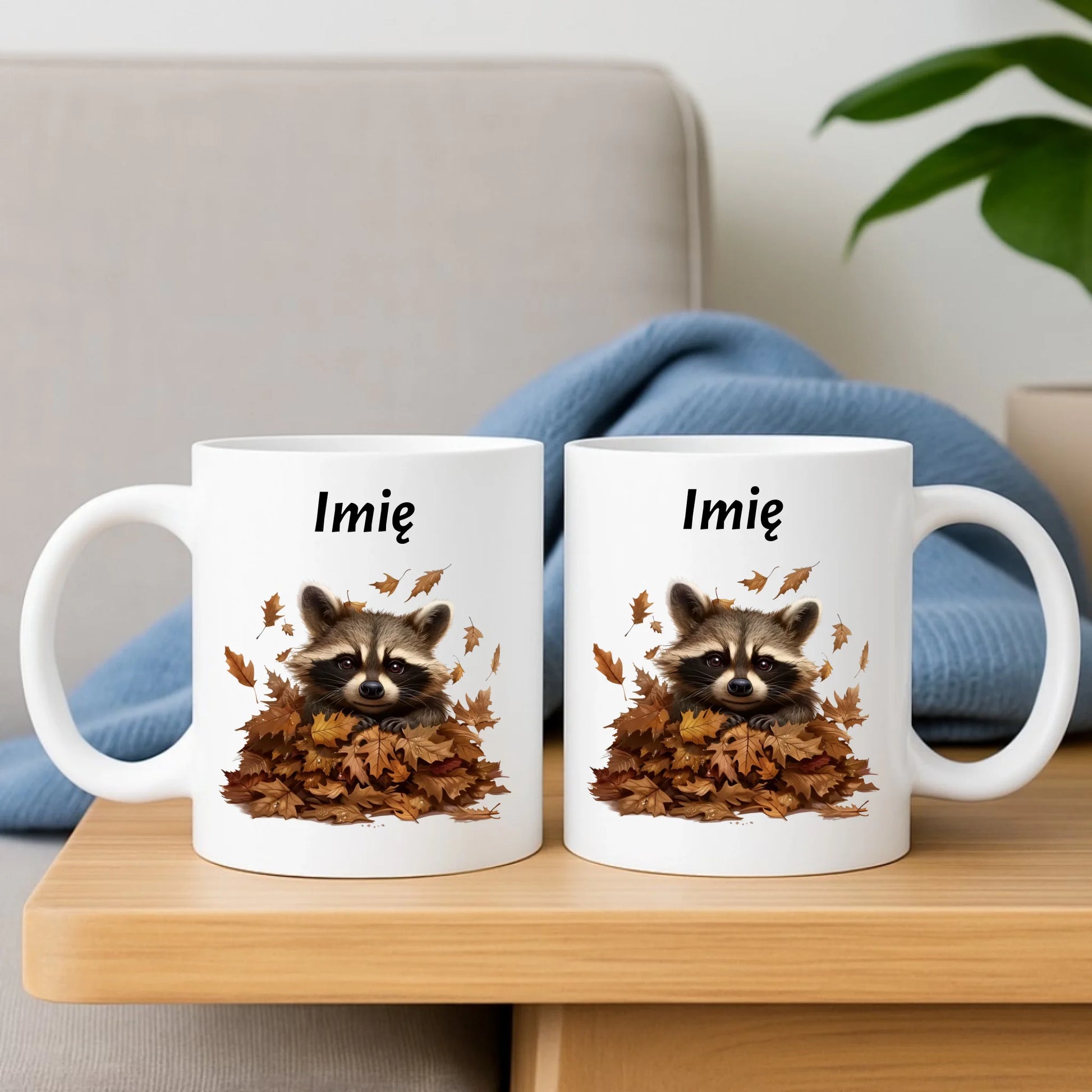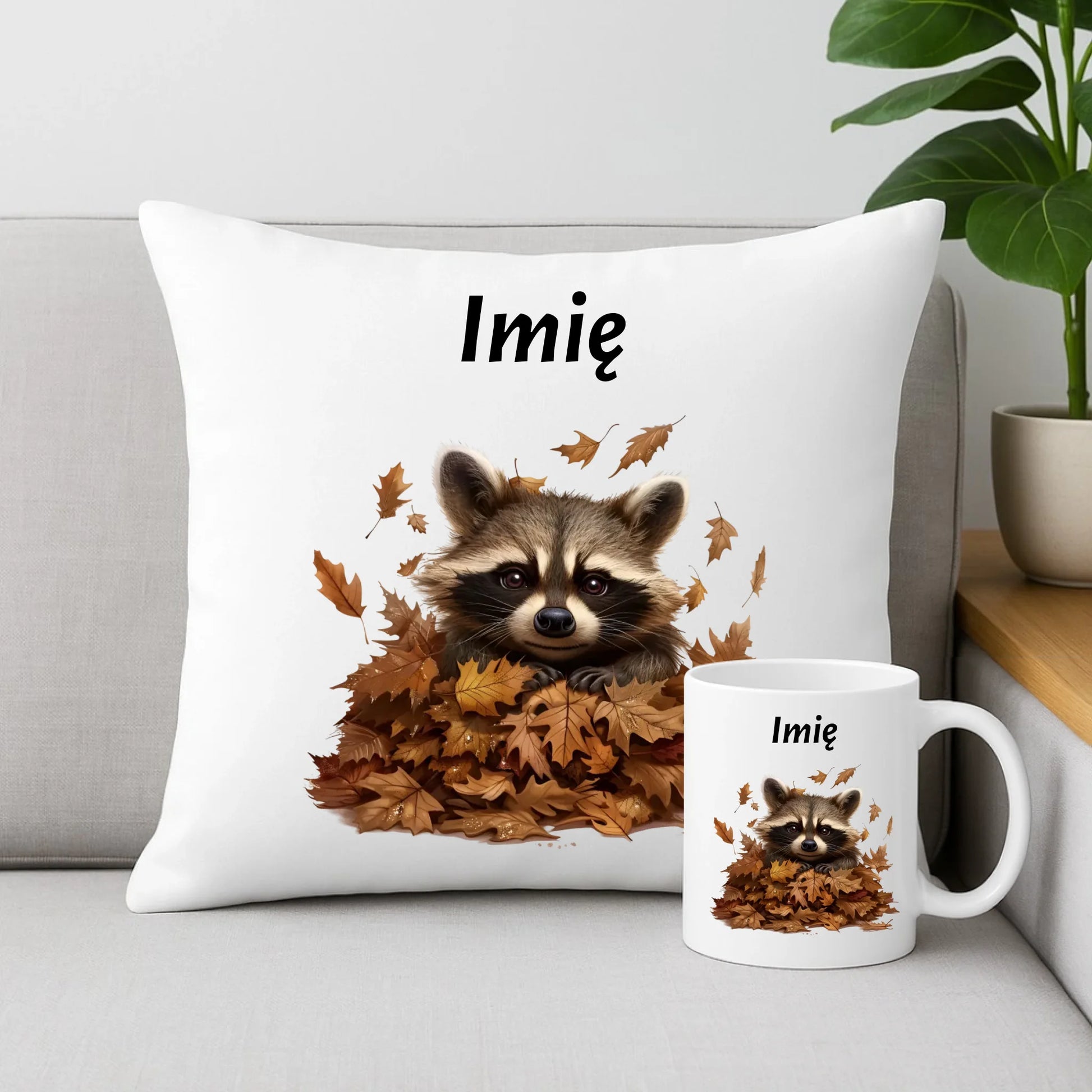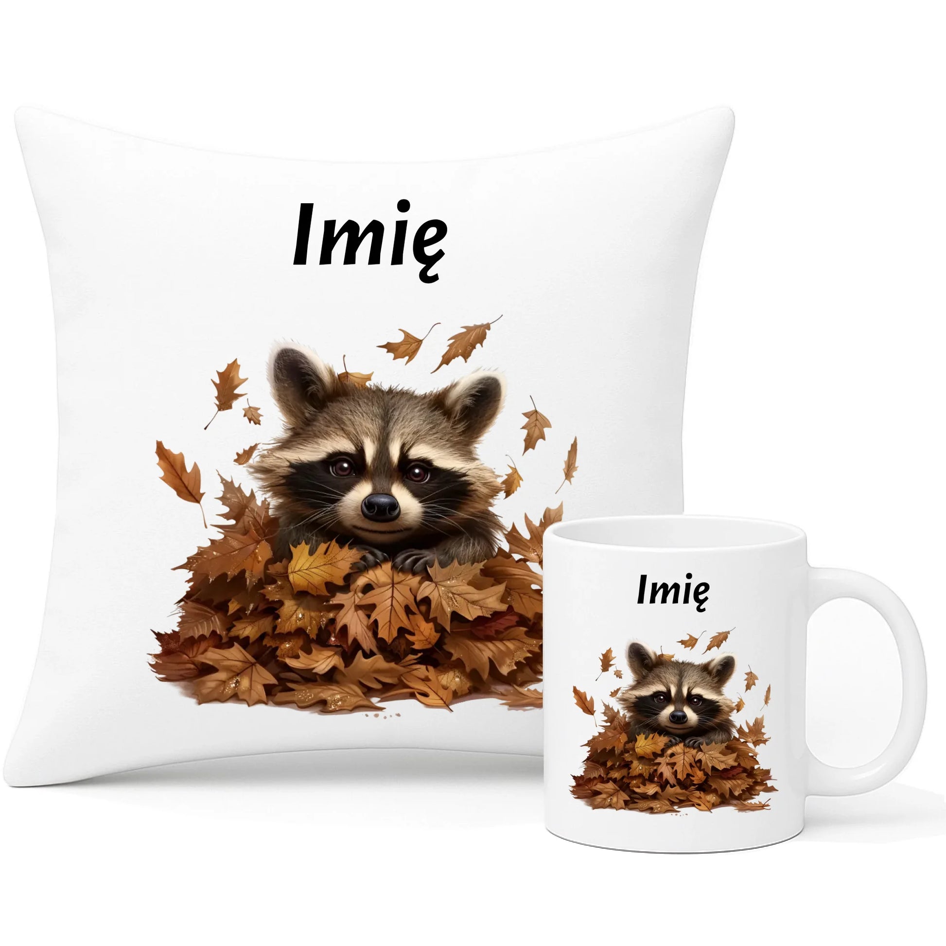 Zestaw poduszka i kubek jesienny - Szop w liściach - personalizowany JS24